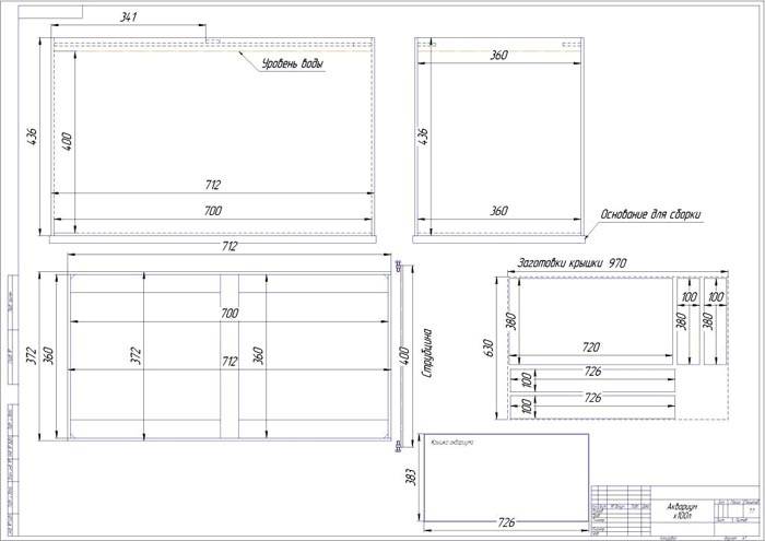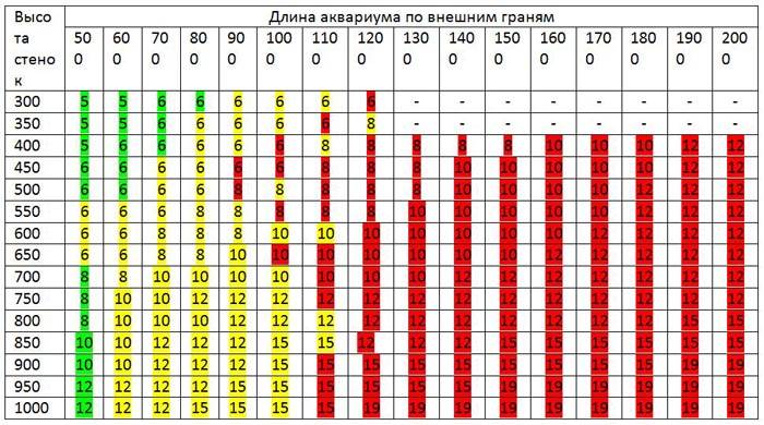 להלן הנתונים על עובי הזכוכית. עמדות מסומנות בירוק בעת יצירת אקווריום פשוט. צהוב - הגרסה עם מקשיחים. אדום - עם פלטה רוחבית ומקשחים אורכיים. כל הממדים הם במ"מ.