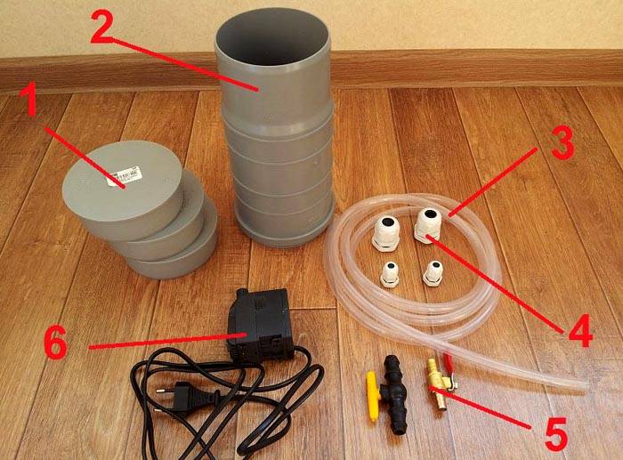 - שני צינורות (3) מוחדרים לכיסוי דרך מכשירי המעבר (4), המבטיחים את הידוק המפרקים. אחד מזין נוזל מזוהם לתחתית המילוי. דרך השנייה, מלמעלה, לוקחים מים נקיים.