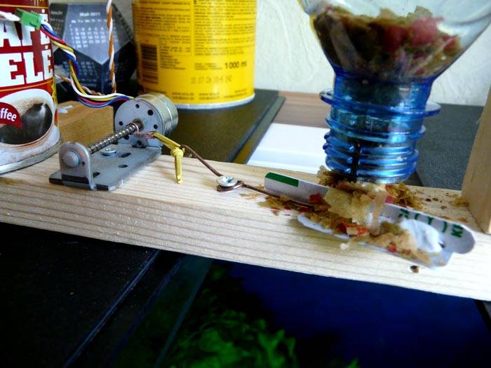 את התוצאה הרצויה ניתן להשיג על ידי התקנת הפלטפורמה בשיפוע קל, מה שמבטיח תנועה של מוצקים בתפזורת באמצעות רטט. כדי ליצור מזין אוטומטי כזה לאקווריום במו ידיך, טלפון נייד ישן שימושי. הוא מחובר באמצעות הר קשיח. הפעלת קריאת "הרטט" תיצור את הלחץ המכני הדרוש. ניתן לשלוט במכשיר כזה מרחוק.