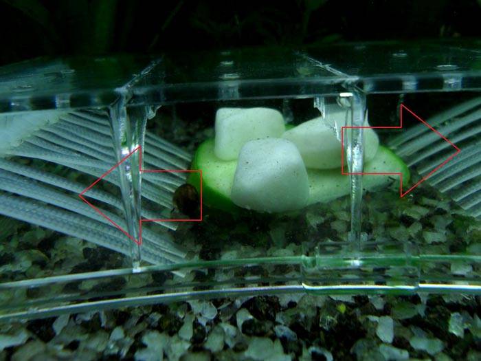 מלכודת חלזונות עשה זאת בעצמך באקווריום צריכה להיות מצוידת במכשיר המספק חופש תנועה רק פנימה. בפרויקט זה, פונקציות כאלה מבוצעות על ידי מסרקים העשויים מחוטי פולימר גמישים (מסומנים בחצים).