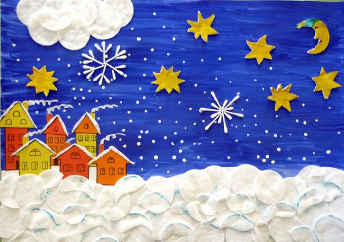 תוכלו להביא את הקישוט לחג לשלמות בדרכים שונות. חלק מהיישומים "מבקשים" להיות מעוטרים בפאייטים נוצצים. כוכבים בהירים נוצרים בשמי הלילה: דבק PVA מטפטף במקומות שבהם הכוכבים צריכים להאיר, ומפוזרים עליו נצנוץ של זהב, לבן או כסף. ברגע שהדבק מתייבש, אתה צריך לפוצץ קצת לעבודה - הנוצצים הנוספים יעופו ויתירו בשמיים ברק של כוכבים יפים.