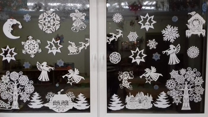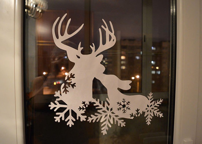 לא טוב להשאיר משטח כה נפלא כמו זכוכית ללא יצירתיות. לכן, אנו בוחרים בחלון יישומי גזירה מתאימים לשנה החדשה.