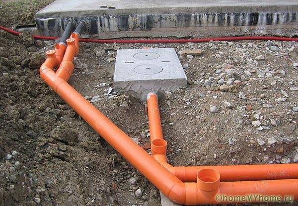 - ראשי ביוב חיצוניים - צינורות שדרכם זורמים הניקוז על ידי כוח המשיכה (לעתים רחוקות יותר בלחץ או בוואקום) מהבית אל תאי מיכל הספיגה, מיכל אוורור;