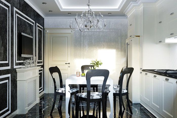 הפיכת מטבח רגיל לחדר מפואר אופנתי מתאפשרת בעזרת האלמנטים האופייניים לסגנון אר דקו: האלגנטיות של הגיאומטריה הולכת יד ביד עם פרקטיות ודיוק של קווים ומרקמים. מעניין לדמיין חדר בצבע לבן עם משטח עבודה שחור.