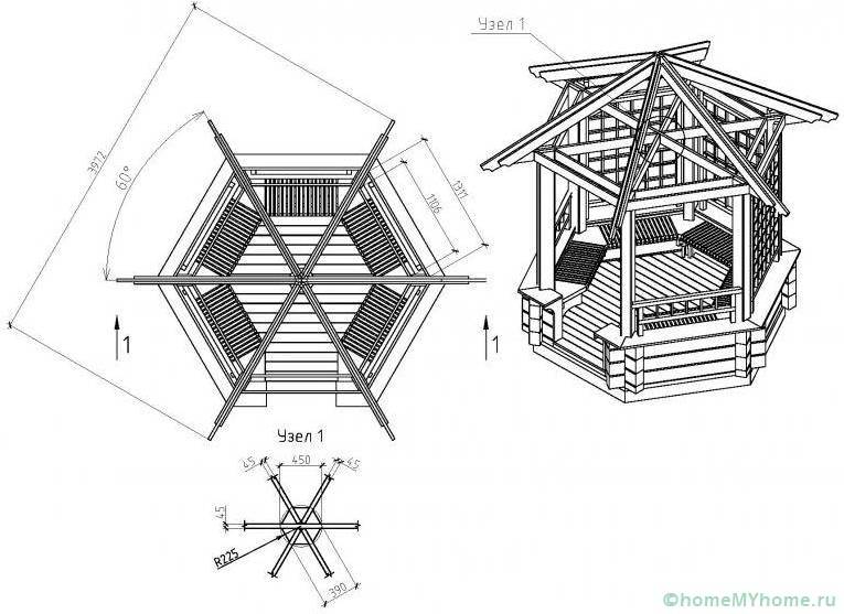 בהתאם למורכבות העיצוב, נדרשים בנוסף קורת חיזוק, פינות פלדה ובולי עץ. לאחר מכן, נשקול את האלגוריתם להקמת ביתן משושה במו ידינו על פי גדלים ושרטוטים בודדים.