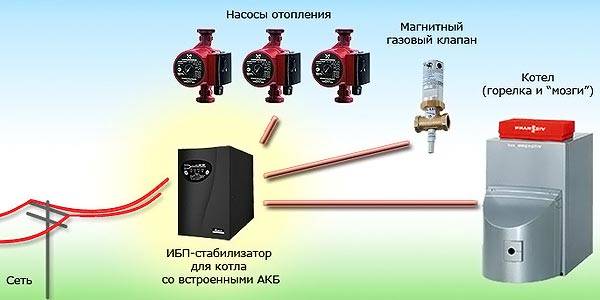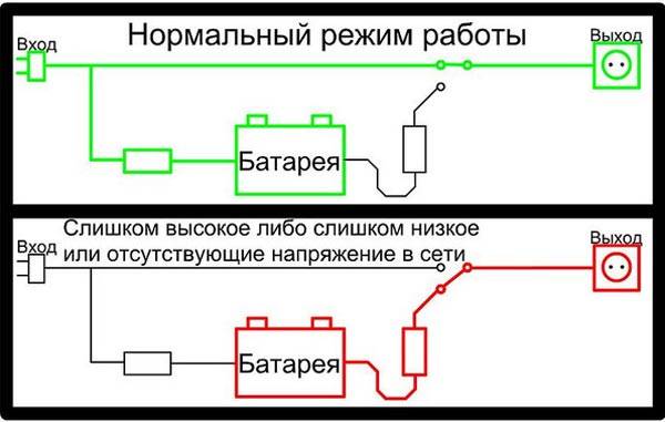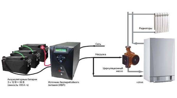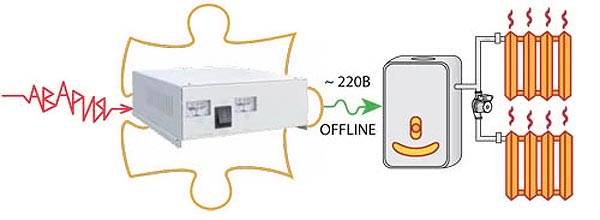 על מנת שה- UPS יפעל במצב נומינלי, הוא דורש גם מקור כוח בצורת סוללת 12 וולט עם יחידת טעינה.ככל שקיבולת הסוללה גדולה יותר, כך היא יכולה לשמור על אוטונומיה זמן רב יותר. מכשיר זה בדרך כלל כבוי ואוחסן אנרגיה בסוללות שלו. מהרשת המתח עובר ישירות לצרכי הדוד ועוקף את ה- UPS. ברגע שהסוללות נטענות במלואן, עוברת בהן אנרגיה במעבר. אם המתח ברשת נעלם, המכשיר מתחיל לשאוב אנרגיה מהסוללות, ומתרחש תהליך הפוך. מהסוללה, הזרם מומר לפרמטרים הנדרשים להפעלת הדוד. היא תוכל לאפשר למקור החום ולמכשירים חשמליים אחרים המחוברים אליו להמשיך לעבוד.