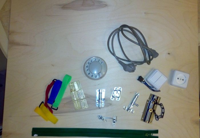 ברגע שהמשטח מוכן, הם מתחילים לתקן את החלקים. צירי דלתות מוברגים באמצעות ברגים עם הברגה עצמית, טקסטיל ופלסטיק מודבקים.