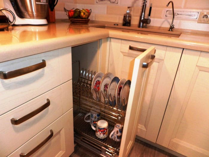אפשרות נפוצה היא גודל מטען סטנדרטי עד 100 מ"מ. עיצוב זה לא רק שהופך לאזור אחסון מצוין, אלא גם ממלא את כל החללים הריקים במטבח, ויוצר מבנה יחיד ואינטגרלי.