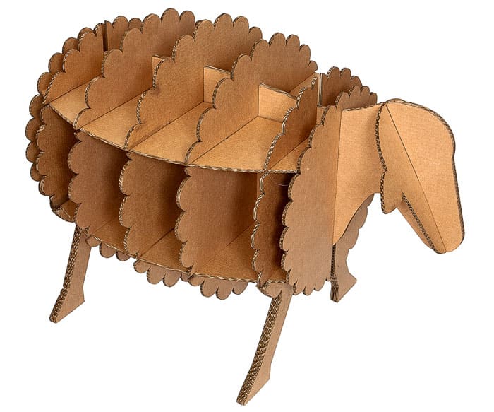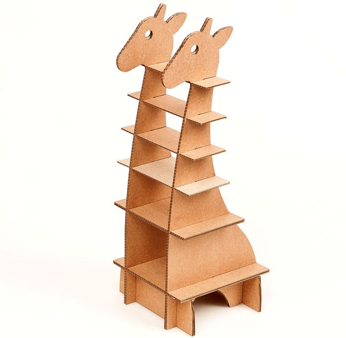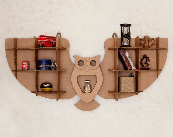 מדפים לא סטנדרטיים יוכלו למצוא לעצמם מקום ראוי גם בבית או בדירה, בין אם זה סלון או חדר ילדים. קרטון גלי מושלם למטרות אלה. גיליונות של תבניות מודבקים יחד לחוזק, ואז מוכנסים מדפים אופקיים לחריצים.