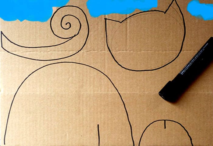חיית מחמד מקרטון חמודה צריכה להיות צפופה מספיק בכדי לעמוד בליטופים של ילדים. העבודה לא קשה: אנו גוזרים את דמות החתול על פי התבנית ועושים חתכים במקום הרגליים לאורך קו המתאר.