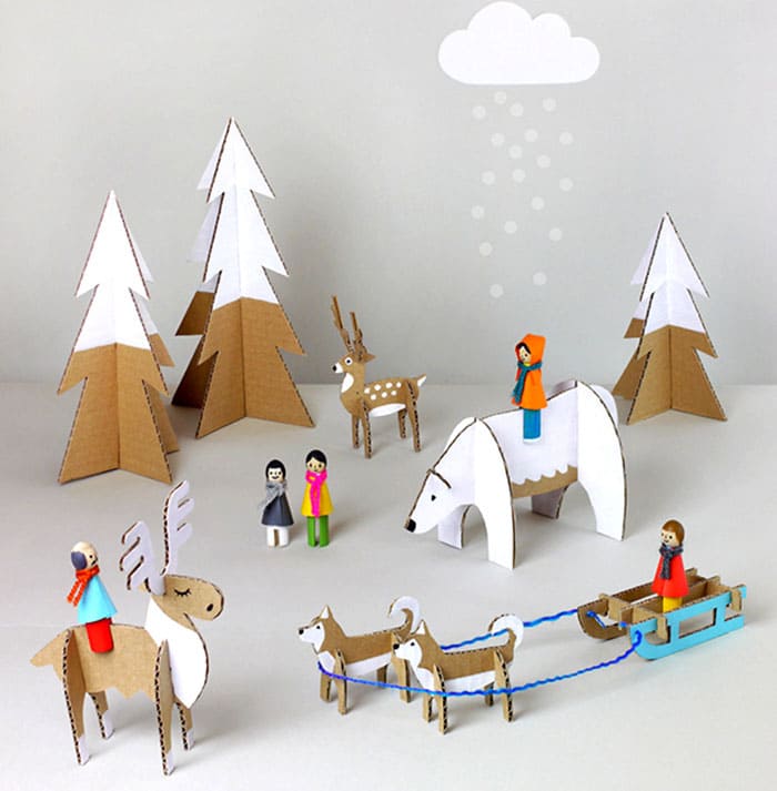 קומפוזיציה שלמה מתקבלת מקרטון עבה, שיאפשר לילד להמציא אגדה ולהדגים זאת בפני כולם. עבור דמויות של אשוחים, צבאים, כלבים ומזחלות, כדאי לקחת קרטון עבה, אך דמויות של אנשים יכולות להיות עשויות מנייר צבעוני וקרטון רגיל.