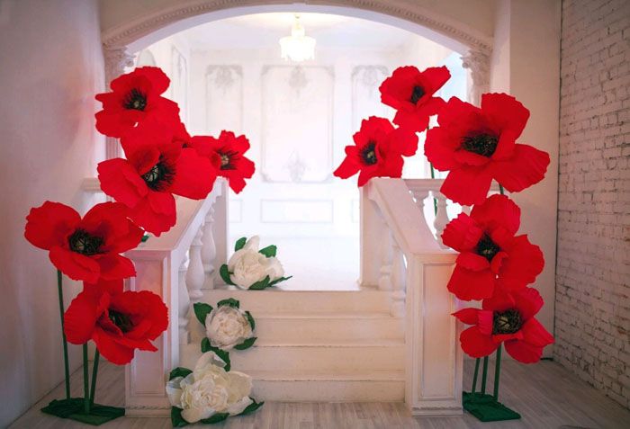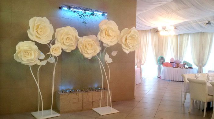 פרחים ענקיים מקצף הם קישוט פנים לבית או לקומת מסחר. תפאורה יוצאת דופן כזו תמשוך מיד את תשומת לב האורחים. כדי ליצור פרח כזה, אתה צריך להשתמש באותם דפוסים, רק גדל בגודל. לחיתוך, עדיף לקחת קצף רול, זה לא יגביל אותך במידות החסר.