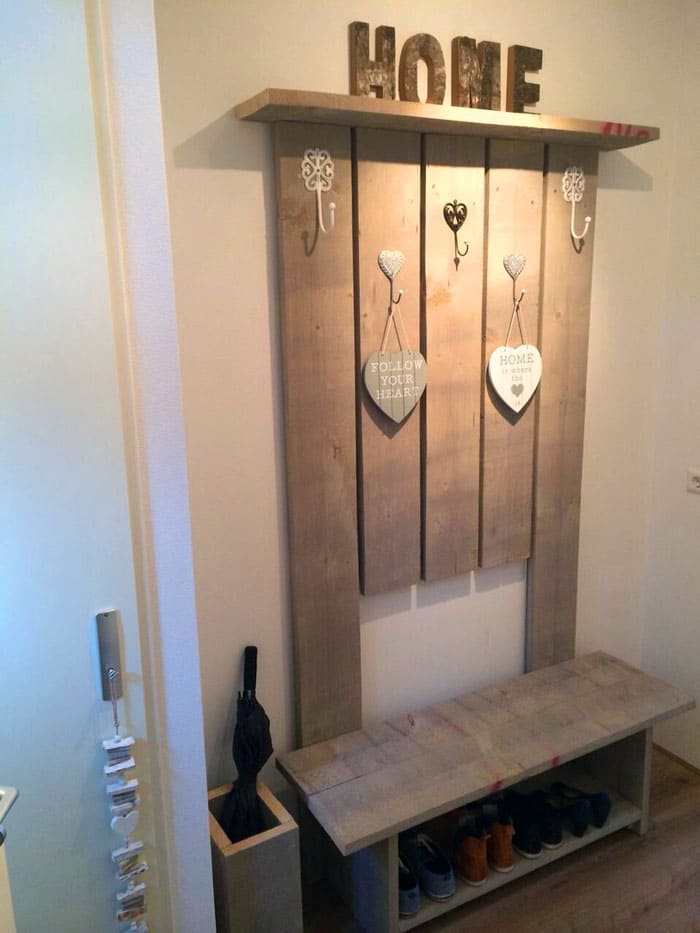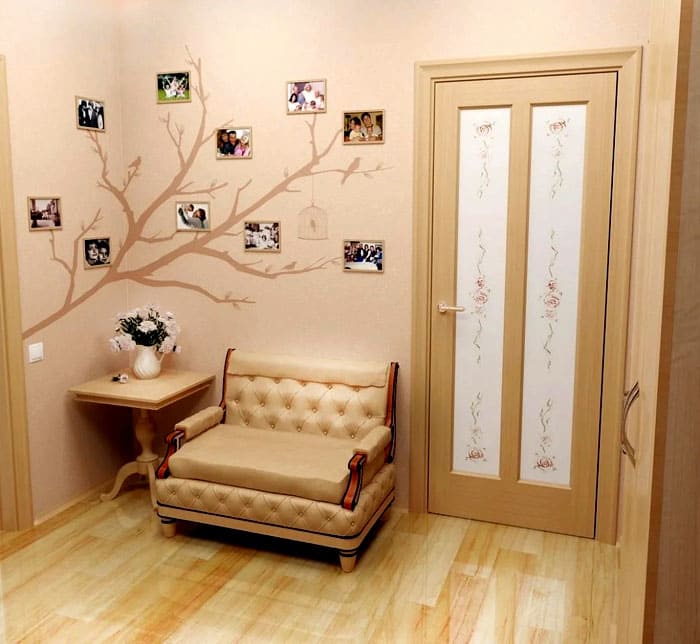 קולאז'י תמונות מעוצבים בדרכים שונות. אם יש ספסל או ספה נוחה במסדרון, מדוע לא להפוך את הפינה לנעימה עוד יותר