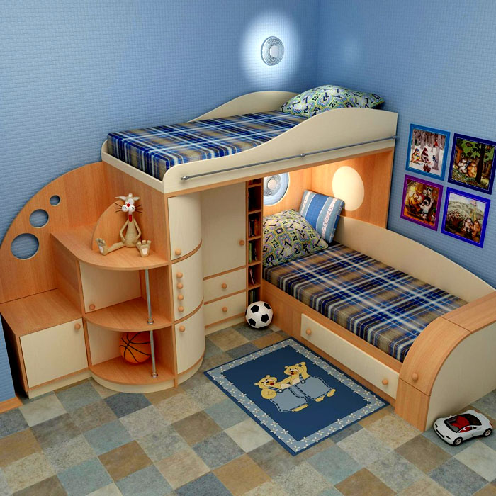בחדר שינה לשני בנים עליכם לארגן מיטות או ספות כדי שלא יפריעו לשני הילדים להתכונן למיטה. אם אזור השינה אינו מצויד מיטות קומותייםואז ריהוט החדר מקבל אפשרויות רבות יותר. לדוגמא, אין צורך להניח מיטות זו לזו, ולהציבן בפינות שונות של החדר.