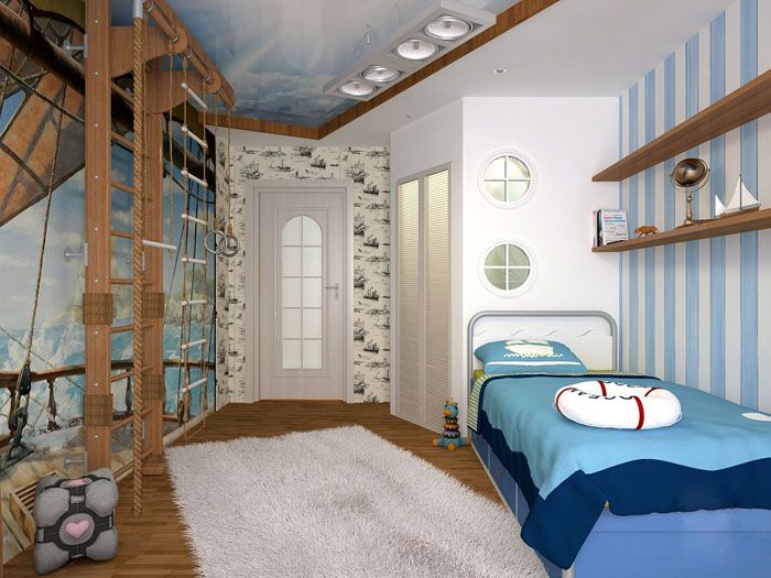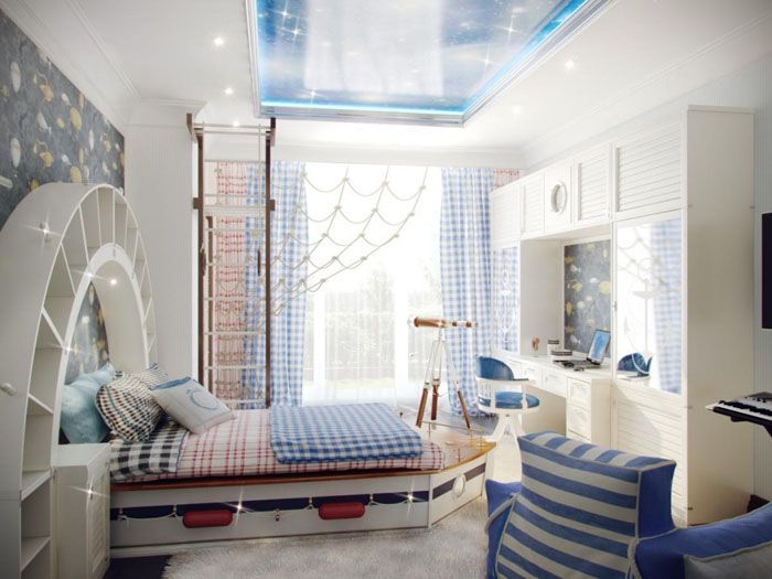 ילד עם נשמה רומנטית יאהב את פינת הים בבית. התנאי העיקרי הוא שציוד הספינה חייב להיות קיים בכל צורה שהיא. בדרך כלל, את תפקיד הספינה ממלאים מיטה או ארון בגדים, או כולם ביחד.