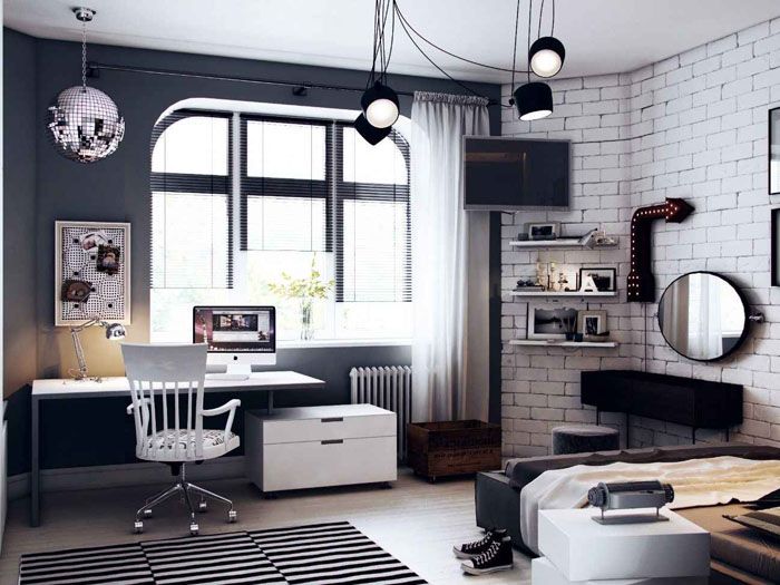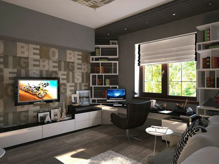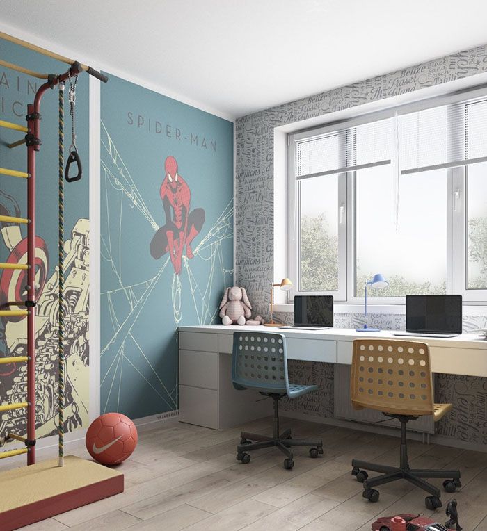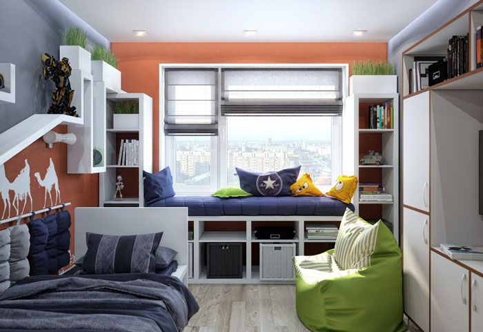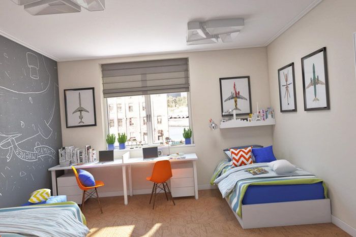 חדר לשני נערים מתבגרים מחולק לשניים: הפריסה צריכה להתבצע על בסיס ויתורים הדדיים. מקום השינה משולב לעיתים קרובות, כמו אזור העבודה, אך אם החדר מאפשר, אז לכל אחד מהם יכול להיות אזור פונקציונלי נפרד.