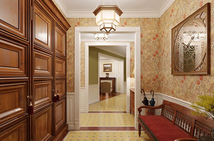 באולם הגדול מותר להשתמש בצבעים עשירים בעיטור הקירות: בורדו, ירוק כהה וחום. השתמש בשילובים מנוגדים עבור יעוד. טפט לאולם הגדול להרים עם דפוס גדול.