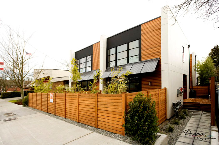 זה יהיה מוזר לראות גָדֵרשאינו תואם את סגנון הבניין הראשי. חובה להיות תמהה לגבי מציאת עיצוב גידור מתאים.גדרות נמוכות עם כנס אבן או בטון מתאימות לסגנון כה מודרני. הארגז נראה טוב על רקע כזה.