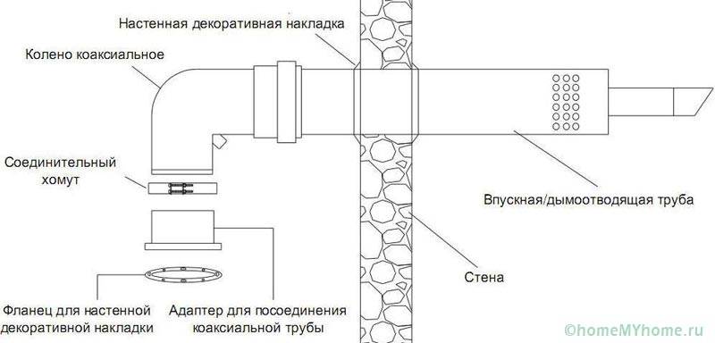 ניתן להביא את המבנה הקואקסיאלי אנכית מעל הגג, לרוחב דרך הקיר, או לחבר אותו לתעלת עשן המובנית בתוך לבני הקיר.