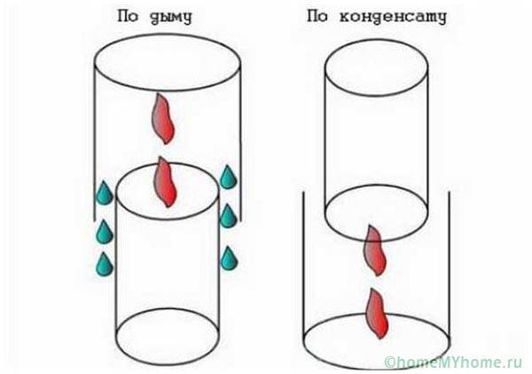 - על ידי עשן - הצינור העליון מונח על התחתון, ומונע חדירת מוצרי בעירה לחדר.