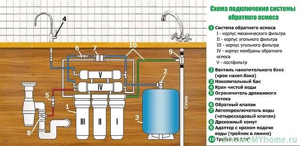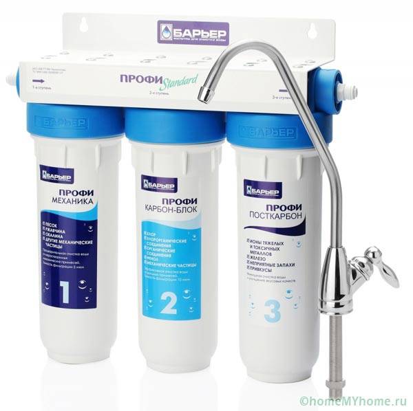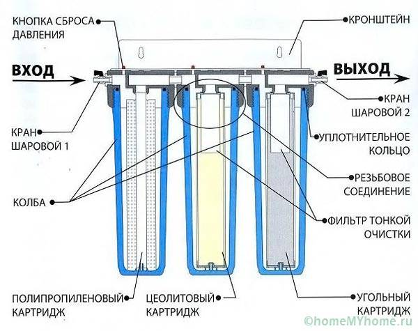 הציוד המותקן מתחת לכיור נקרא מסנני זרימה. הניקוי מתבצע במהירות של 1.5 ליטר בכל דקה, משאב המחסניות הוא 1500 - 2500 ליטר. לאחר מכן נדרש החלפה (בערך פעם ברבעון).