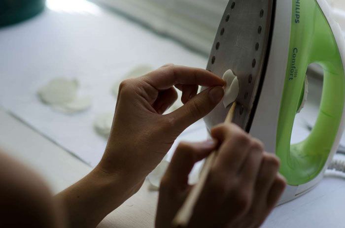 חָשׁוּב! לעבודה, לא משתמשים במגהץ חם, אלא במגהץ חם. הפלטפורמה החמה יכולה להמיס חומר עדין.