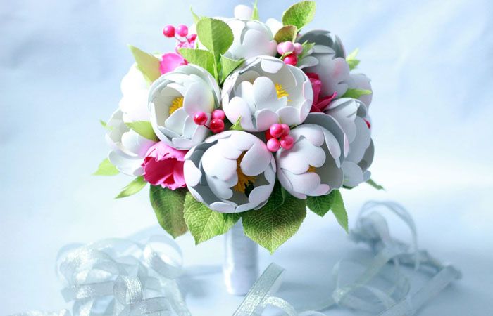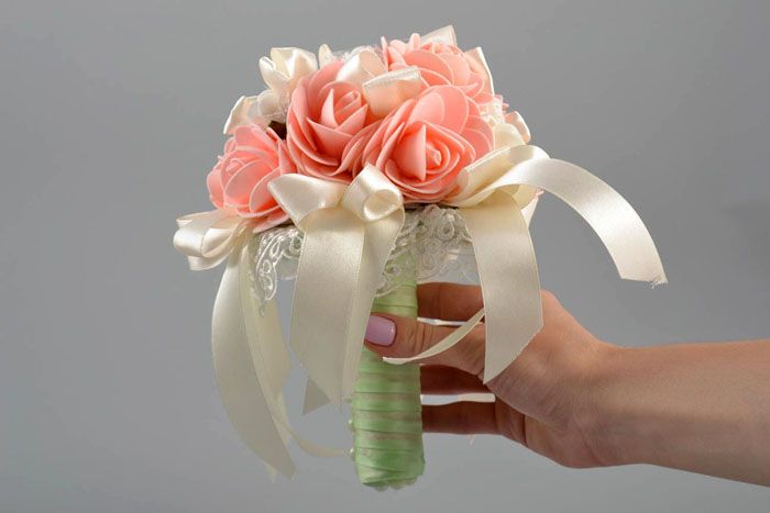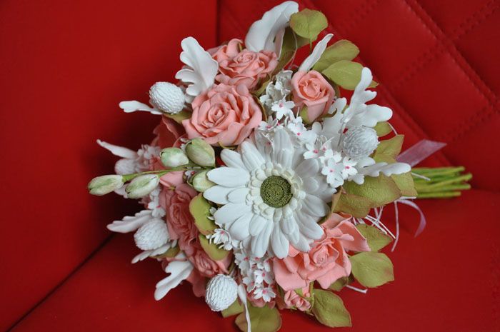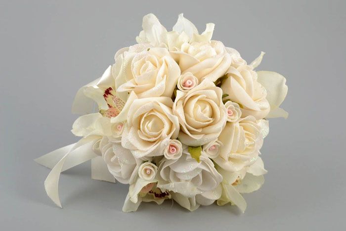 בעלי מלאכה מייצרים דברים ייחודיים ובלעדיים באמת מזמש רך. חומר זה פופולרי במיוחד בייצור אביזרי חתונה. בוטוניירות בחורי כפתורים של תלבושות האורחים, קישוט שולחן חגיגי, כלים וכוסות - כל זה יאיר כל חג. שיק מיוחד הוא זר לכלה מ foamiran. ללא רבב, חזק ועמיד - זה לא יאכזב אותך ברגע חגיגי. הכלה לא תרצה להיפרד מזר כזה, ואין בזה שום דבר - הוא יישאר במשפחה הצעירה כקישוט של הבית. התבונן בתצלום כיצד נראים פרחים מ- foamiran בעיצובים שונים.