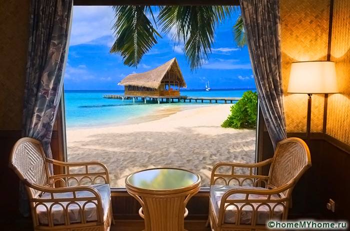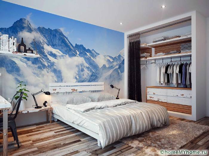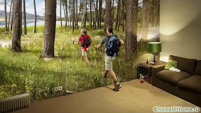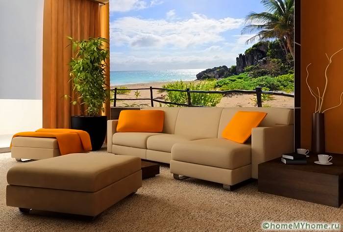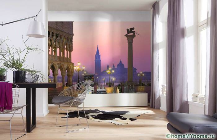 מידע מועיל! יש לשלב את הצבעים של טפט הצילום עם פרטי פנים אחרים. על מנת לא לצאת מהתפיסה הכללית של הסגנון, יש לשייך אלמנטים בודדים לתמונה על הקיר. זה יכול להיות ריצוף דומה או אבנים דקורטיביות.