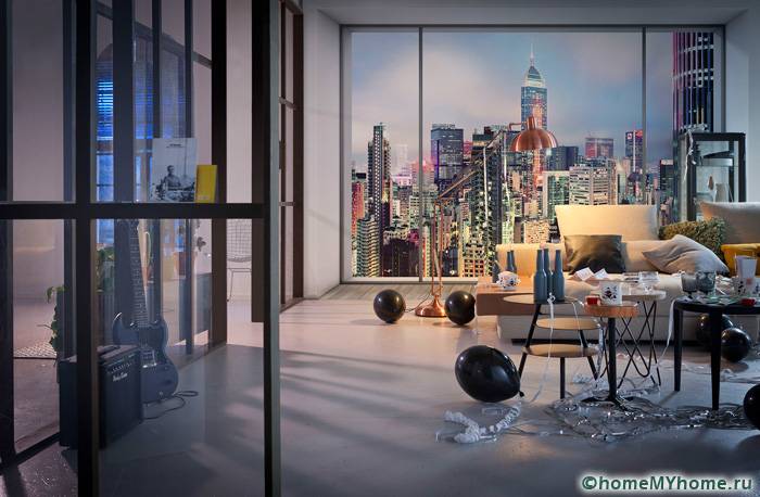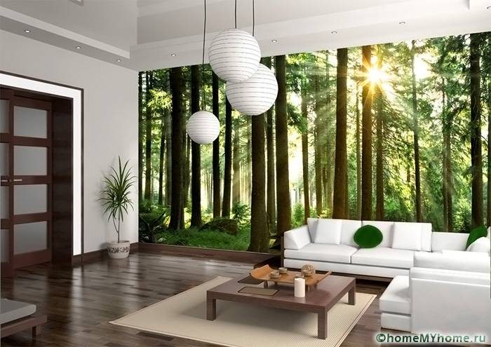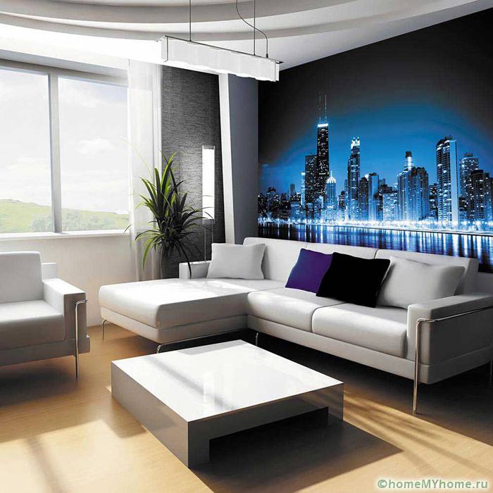 לעתים קרובות טפט משמש לחדרי מגורים. זו דרך נהדרת לא רק להרחיב חזותית את החלל, אלא גם לקשט קיר שלם ללא רהיטים. תמונות פנורמיות ונוף פופולריות. חללי פנים בהייטק משתמשים בתמונות של ערים גדולות.