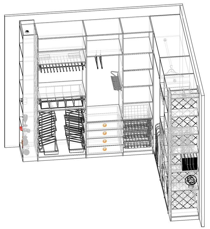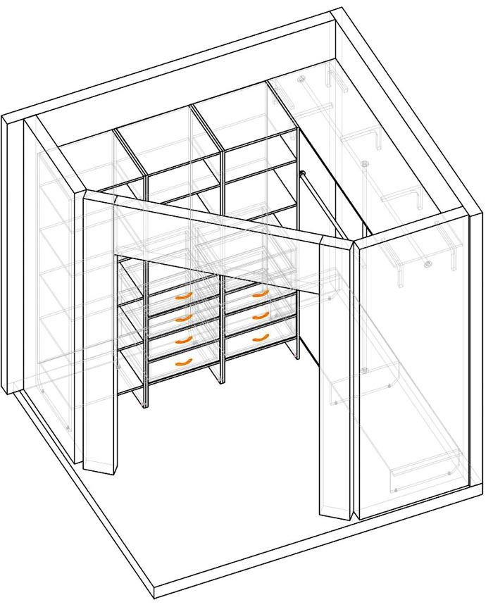 - תא אחסון בינוני לחפצים הנפוצים ביותר שלכם. באזור זה מסופקים פנטוגרפים, מוטות וכן מדפים נשלפים עליהם ניתן להניח פריטי שירותים קטנים. גובה האזור האמצעי תלוי באורך הפריטים. הממדים הממוצעים הם בטווח של 1.4-1.7 מ '. כדי להכיל מעילים וחולצות, מספיק לספק תא בגובה 1 מ'. עבור פריטים סרוגים כדאי לספק קופסאות וסלסלות שניתן להניח על המדפים;