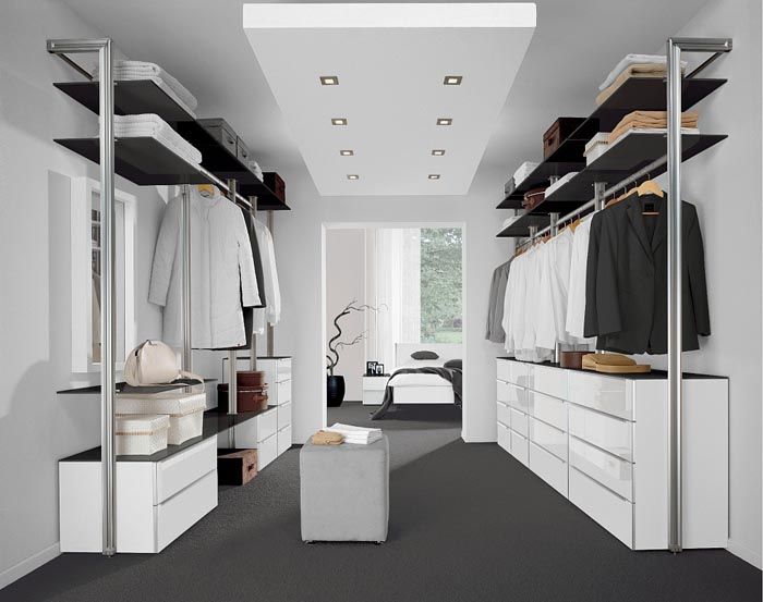 המילוי הפנימי של חדר ההלבשה, המופרד מהחלל הראשי, יכול להיעשות בדרכים שונות: לאורך קיר אחד או לאורך שני הקירות בבת אחת. הפיתרון הראשון כולל סידור קומפקטי של כל האלמנטים המבניים לאורך קיר אחד. מדפים ו מתלים לסילוק חסכוני יותר של האזור, הם מבוצעים באופן פתוח. מרחב פנוי משמש לעתים כחדר הולם.