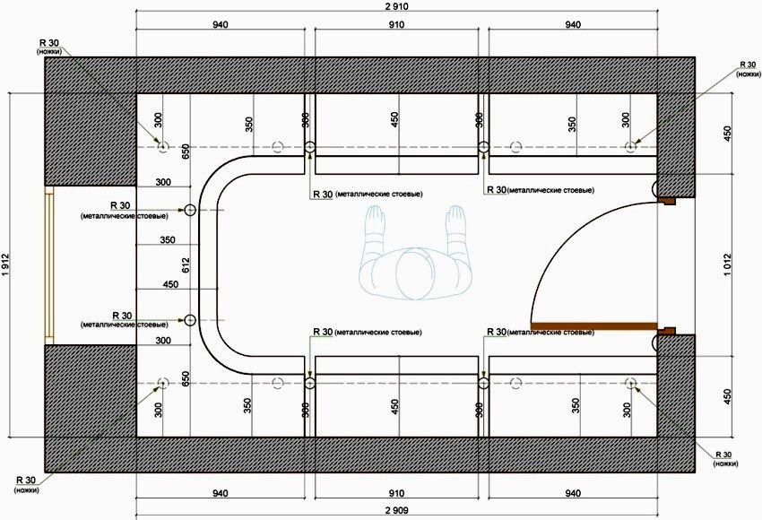 בעת פיתוח רישום ודיאגרמה, יש לקחת בחשבון את הפרמטרים הגיאומטריים של חדר ההלבשה העתידי. המרחק בין הקירות לא צריך להיות פחות מ 1.6 מטר. הרוחב הקטן יותר ייצור קשיים חמורים בשימוש בחדר.