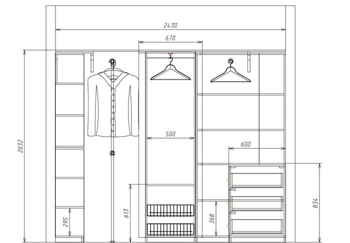 פרויקטים כאלה פופולריים למדי בשל קלות הביצוע והקומפקטיות שלהם. הסט ממוקם לאורך קיר אחד, ומאפשר לך להקצות את המינימום האפשרי, אך מספיק מקום להצבת רהיטים. התמונות הבאות יעזרו לך להבין את המהות של חדר ההלבשה הליניארי ואת התכונות של פיתוח דיאגרמות ושרטוטים.