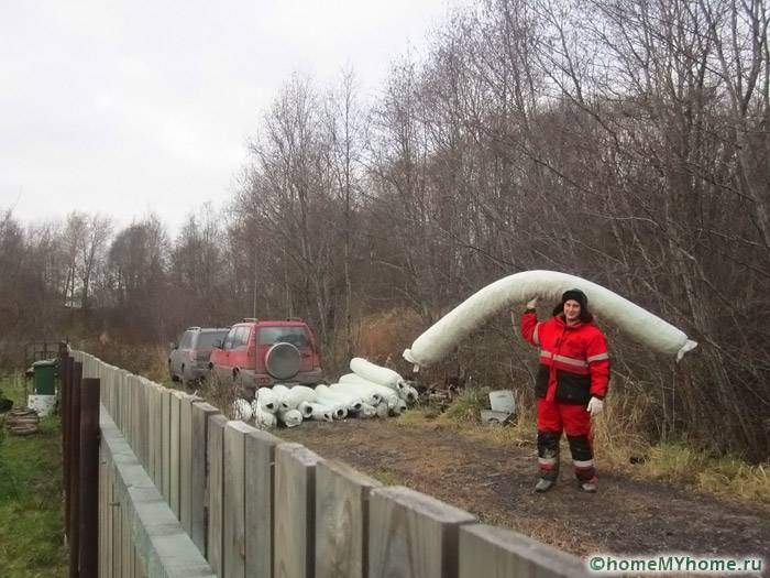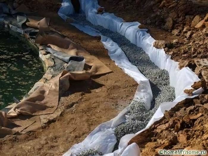 - לאחר מכן, אריחי geotext מונחים עם שחרור מהתעלה של לפחות 1-2 מ '. אם יש צורך, חותכים את הבדים בסכין פשוטה.
