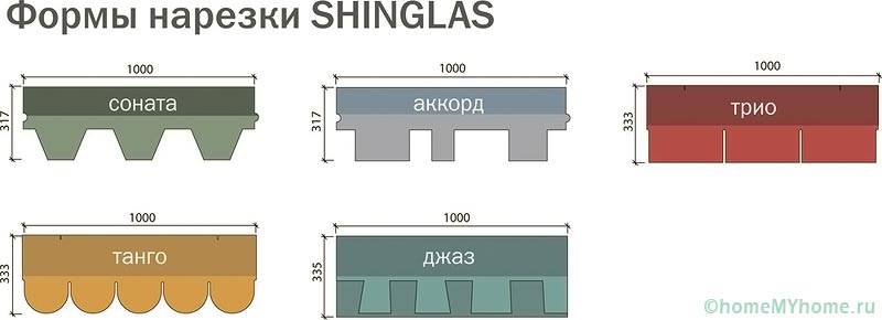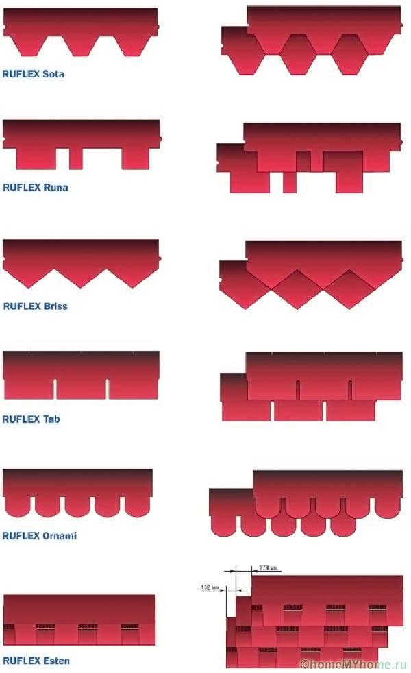 לרעפים של יצרנים שונים אין אותם מידות (פורמט בינוני 1 x 0.35 מ '), בעובי 3 מ"מ. ישנם מספר סוגים של תבנית אריחים: