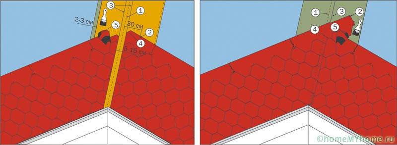 - פתוח - הרעפים משוגרים משני הצדדים לשטיח העמק, מסמרים ממוסמרים 30 ס"מ מציר ההזדווגות, שני קווים מוכים עם חוט מצופה במקביל לציר בכל מדרון, חומר הגג נחתך לאורך קווים אלה, ומניח לוח, מודבק במסטיק, מקובע במסמרים בצורה הרגילה;