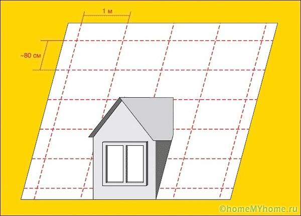 - במקביל לתליית הגג או לרכס, מסומנים קווים לכל אורך המדרון כל 0.8 מ 'לכל 5 שורות אופקיות;