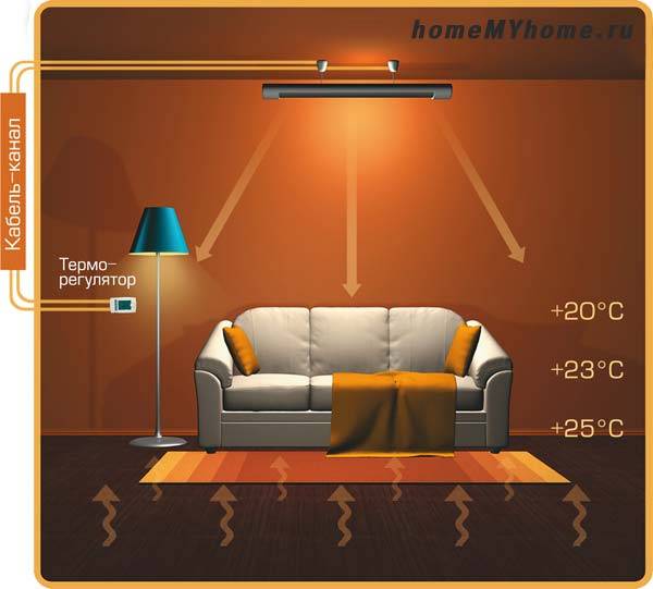 - חימום כזה אינו דורש בידוד תרמי יסודי של החדר, מכיוון שהוא אינו משפיע על האוויר, אלא על חפצים ואנשים, מה שאומר שהחום שלו לא ייצא לרחוב, מכיוון שהוא לא באוויר ככזה.הודות לתכונה זו תוכל להתחמם בכפור קשה אפילו ברחוב;