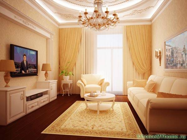 אולם בדירה סטנדרטית הוא חדר מלבני עם שטח קטן. תקרות מתיחה משמשות לאזור החדר, כדי להעניק לו נפח וצבעים. גימור מסוג זה פשוט, זול יחסית, עמיד ונראה מושלם. פנים האולם הקטן בדירה, שתצלומו מוצג למטה, מתעורר לחיים בזכות התקרה המורכבת.