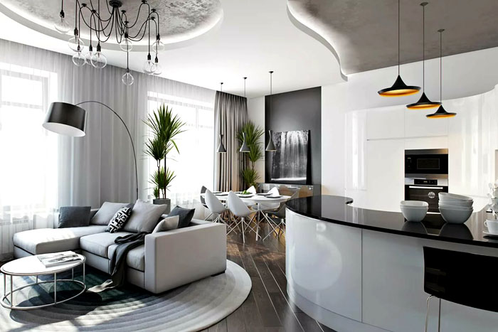 הגורם העיקרי בגימור עיצוב דירה בסגנון מודרני הוא היעדר הגבלות מוחלט. אין יותר מחייב קווים קפדניים ואלמנטים דקורטיביים. אנו מציעים מספר אפשרויות לעיצוב מעניין מעיצוב פנים עם תמונה.