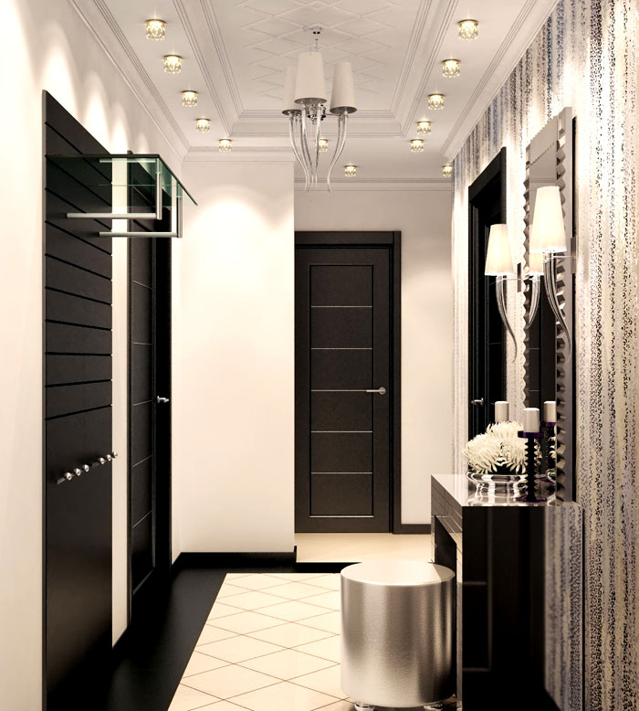עיצוב מעניין מאוד. תשומת הלב מופנית למנורה עם מבנה מקורי. הניגוד של כהה ואור הופך את המסדרון לצרוך וארוך ויזואלית.