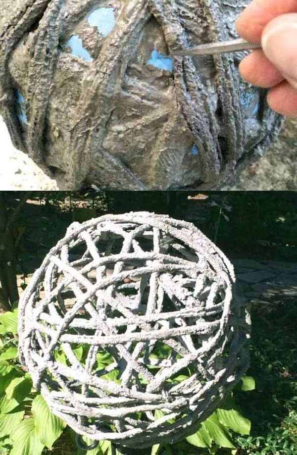 כדור מנופח, חבל נפתל סביבו, עובר דרך תמיסת מלט. עבוד אך ורק עם כפפות! לאחר זמן מה, המלט יתקשה, הכדור יתפוצץ מעצמו, את העודף מהמוצר מנקים בקלות בעזרת סכין, והחצר רוכשת קישוט חדש.