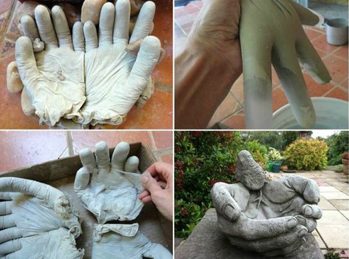 כפפות גומי מלאות במלט, צורת כפות הידיים העתידיות מוגדרת מעט ונותרת לייבוש. הגומי נחתך, וסיר נפלא חדש או קערת שתייה לציפורים מופיעים בגן