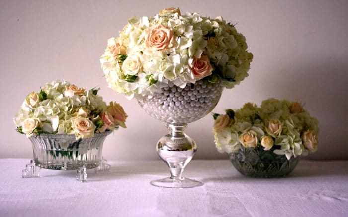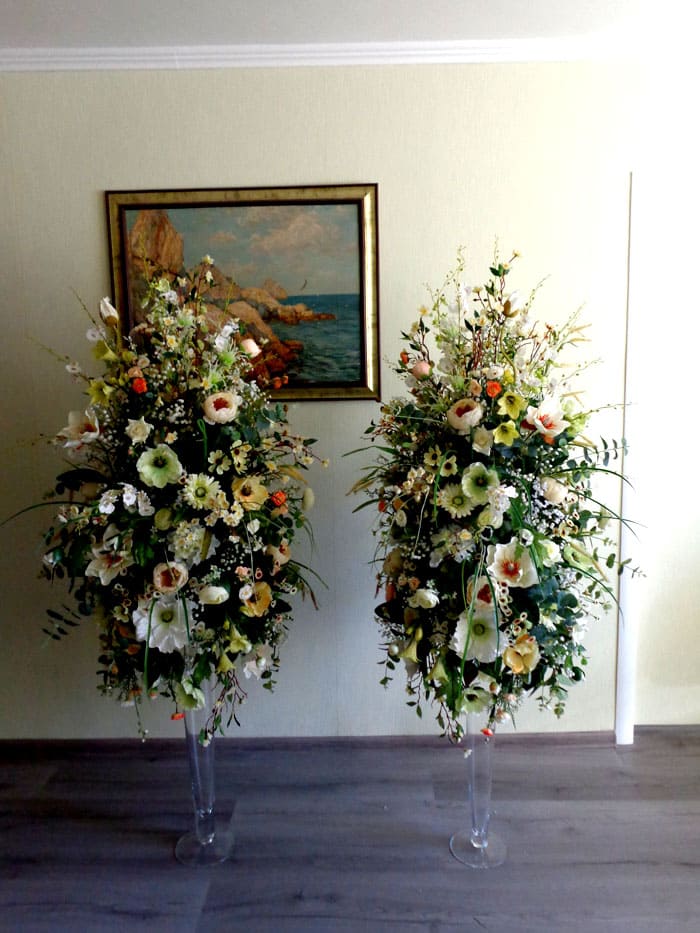 זרי פרחים מלאכותיים באגרטלי זכוכית כאלמנט של תפאורה מסוגננת