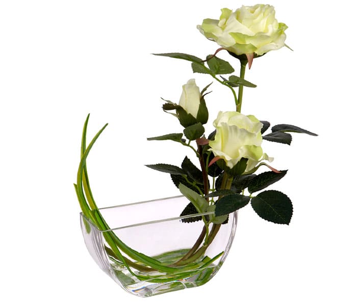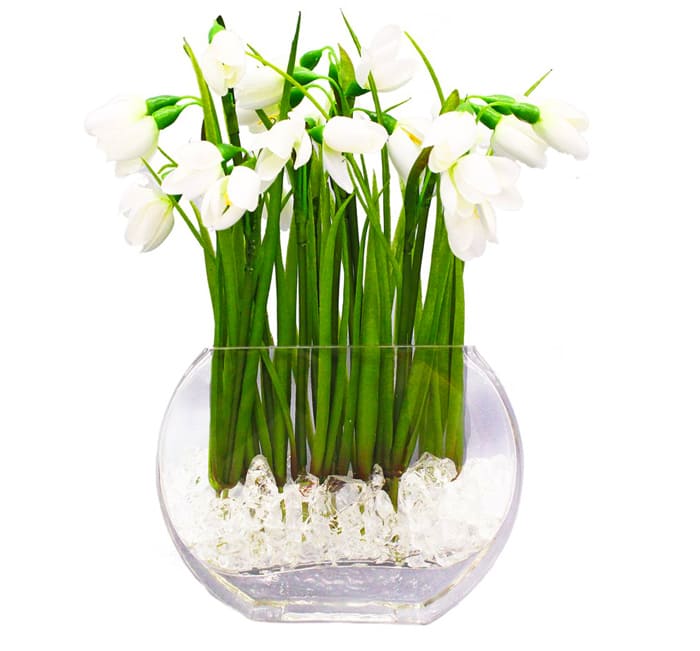 קומפוזיציות הפנים האלגנטיות ביותר של פרחים מלאכותיים, הממוקמות ב אגרטלי זכוכית... זה לא מעשי במיוחד בבית בו רצים ילדים קטנים, אך הוא מביא סגנון ואלגנטיות של פתרון מודרני לכל פנים.