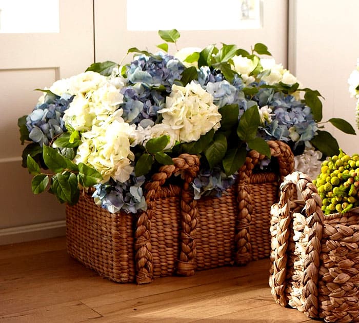 סלי רצפה גדולים דורשים צמחים גדולים באותה מידה. זה יכול להיות הידראנגאה, אדמוניות, ורדים והרכבים מהם בתוספת מינים אחרים