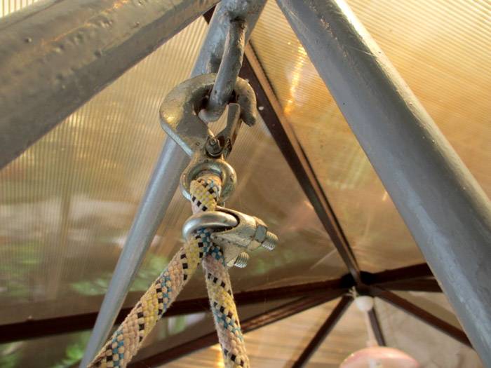כדי לחבר בצורה מאובטחת חלקים בודדים של מבנה מתלים תוצרת בית, אתה יכול להשתמש בקרביני מתכת עם מלחציים בורג