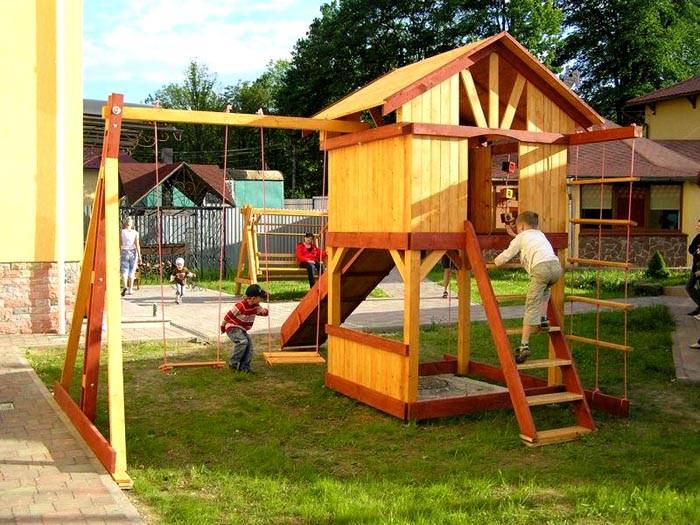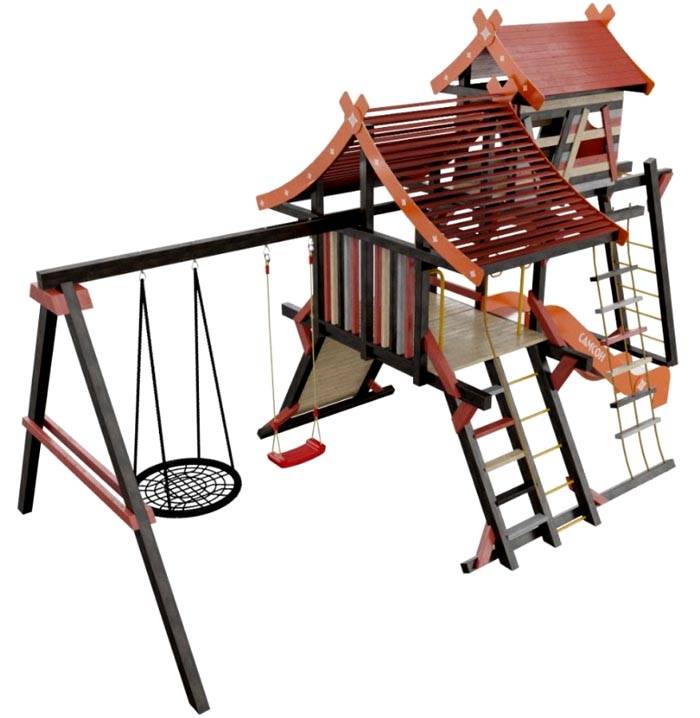 נדנדה עם מגלשה, ארגז חול, בית, מדרגות גמישות. ניתן להשתמש במתחם כזה לארגון משחקים ופעילויות ספורט שונות.
