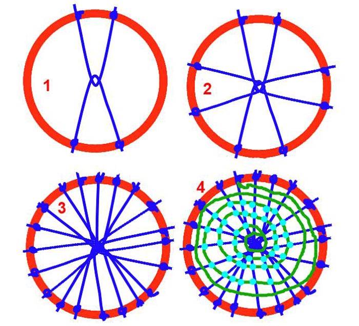 - בשלב הראשון (1), שני חבלים נקשרים על החישוק בזווית חדה. רכיב דומה נוצר בצד הנגדי עם חפיפה של לולאה במרכז במהלך ההתקנה.