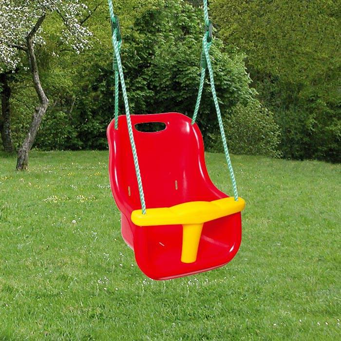 מושב פלסטיק לנדנדת ילדים עם מחיצת קיבוע. הצורה הארגונומית מספקת התאמה נוחה לילד. ניתן להתקין חגורת מותן נוספת בחריצים מיוחדים